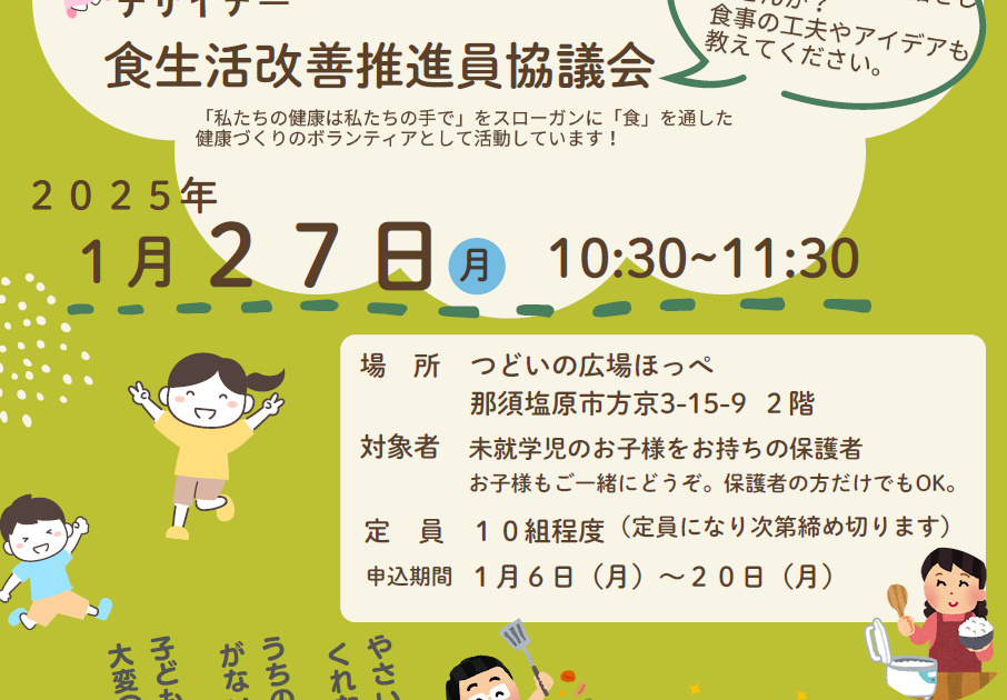 日時:2025年1月27日(月) 10:30〜11:30 場所:つどいの広場ほっぺ 那須塩原市方京3-15-9 2階 定員:10組程度 申込締切:1月20日(月) 申込 https://docs.google.com/f […]