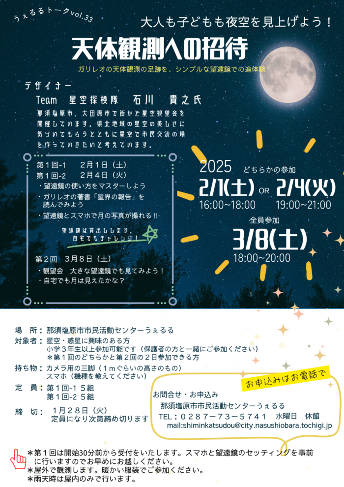 (注)屋外で観測しますので暖かい服装でご参加ください。天候が悪いときは屋内で実施します。