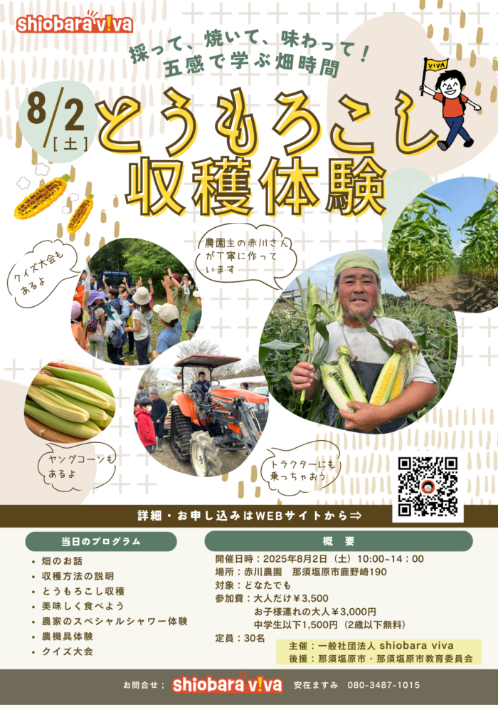 イベント 8/2 とうもろこし収穫体験 2025.07.04 by yellnasushiobara 0 「 採って、焼いて、味わって!五感で学ぶ畑時間 とうもろこし収穫体験 」 日時:8/2(土) 場所:赤川農園(那須塩原市鹿野崎190) 収穫して、感じて、学ぶ。 とうもろこしから広がる“ほんものの食育体験” 詳細・申込み https://shiobaraviva.com/agri-corn