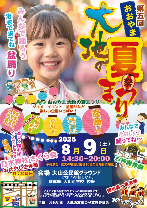 イベント 8/9 第5回おおやま大地の夏まつり 2025.08.01 by yellnasushiobara 0 【第5回おおやま大地の夏まつり】 8月9日(土曜日) 14;30〜20;00 場所;大山公民館グラウンド