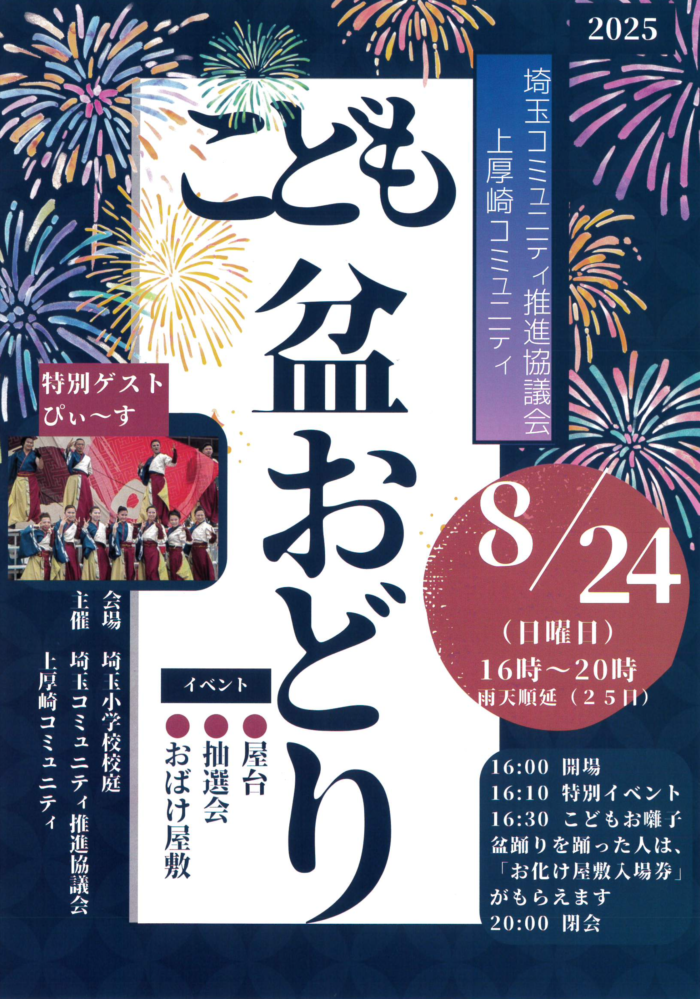 イベント 8/24 埼玉・上厚崎コミュニティこども盆踊り 2025.08.07 by yellnasushiobara 0 日時:2025年8月24日(日) 16:00〜20時 雨天順延:25日 場所:埼玉小学校校庭