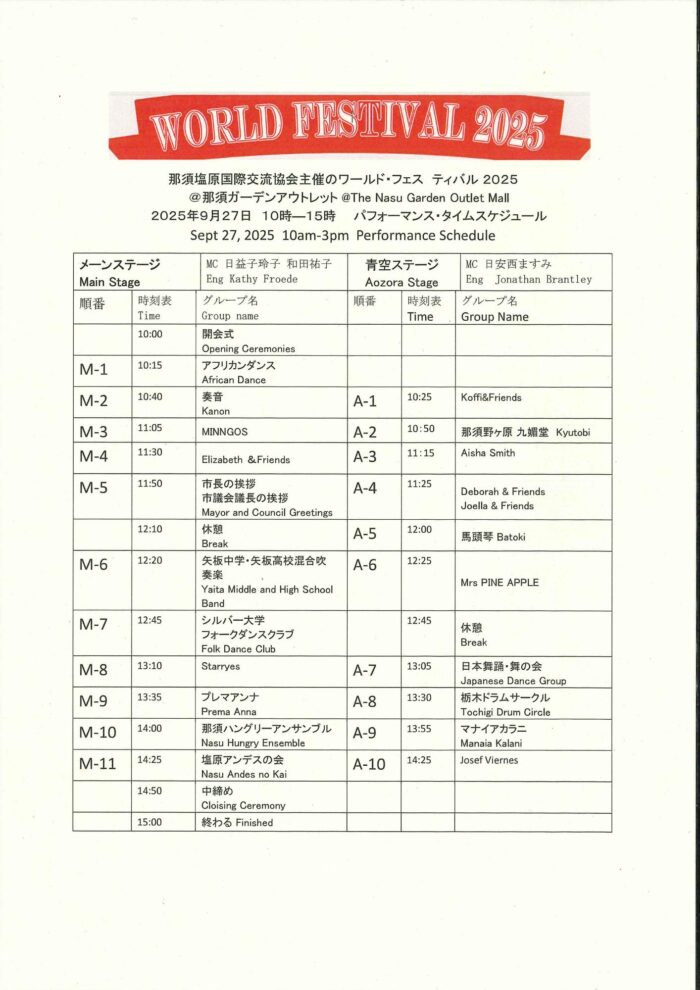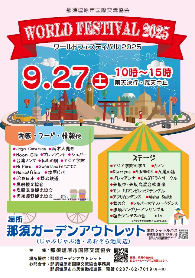 イベント 9/27 ワールドフェスティバル2025 2025.08.29 by yellnasushiobara 0 日時:2025年9月27日(土曜日)午前10時から午後3時 場所:那須ガーデンアウトレット じゃぶじゃぶ池周辺 内容:ステージでの音楽・舞踊 テント内での物販 主催:那須塩原市国際交流協会