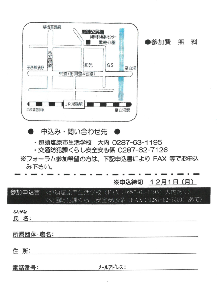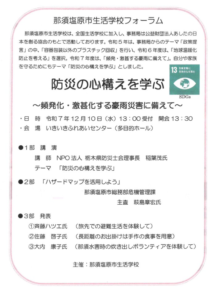 イベント 12/10 那須塩原市生活学校フォーラム 2025.11.13 by yellnasushiobara 0 日時;12月10日(水)13:00受付 場所:いきいきふれあいセンター(多目的ホール) 11