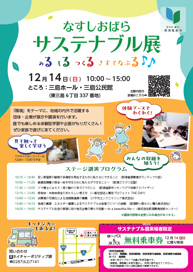 ■日時… 12月14日(日)10:00〜15:00(開場9:45~ 市長挨拶は10:00~になります!!)■場所…三島ホール・三島公民館( 那須塩原市東三島6丁目337番地)■内容…①講演(那須どうぶつ王国、 那須塩原市ツキノワグマ対策アドバイザー etc.) ②環境に関する取組をしている団体・企業の活動内容の展示( 体験ブースやウサギふれあいタイムなどもあり、 子どもも楽しめます!) ③キッチンカー(ナポリピッツァ、豚汁、米粉クレープ etc.)■対象…どなたでも(参加無料)