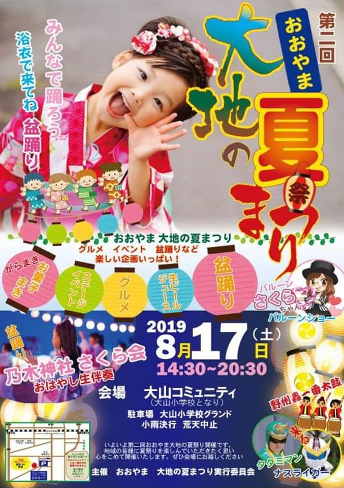イベント 8/17 おおやま大地の夏まつり 2019.08.16 by yellnasushiobara 0 第2回のおおやま大地の夏まつり 8月17日(土)14:30〜20:30 浴衣できてくださいね。 ナスライガーやタタミマンもやってきます。