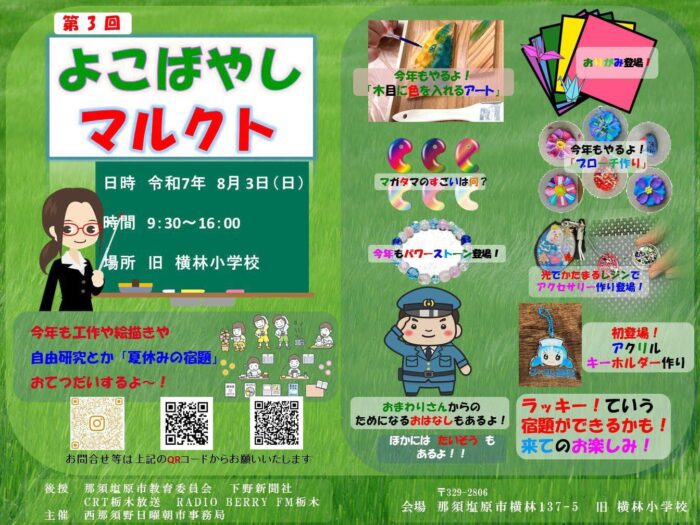 イベント 8/3 よこばやしマルクト 2025.07.31 by yellnasushiobara 0 日時:2025年8月3日 9:30〜16:00 場所:旧横林小学校 西体操教室では昨年に続き、マット、鉄棒、トランポリンの無料体験を行います。 工作や絵描き、自由研究などのワークショップ、飲食店やキッチンカーも出店されます。 楽しい一日が過ごせるよう、夏休みのお手伝いを行ないます、皆さまのご来場をお待ちしております。 0