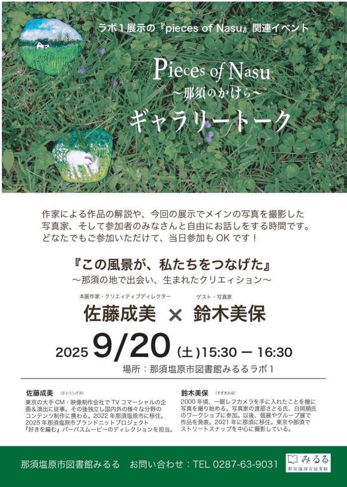 2025 9/20(土)15:30 ~ 16:30、クリエィティブディレクターの佐藤成美氏と写真家の鈴木美保氏による、ラボ1で展示中の『Pieces of Nasu~那須のかけら~』ギャラリートークを開催いたします。