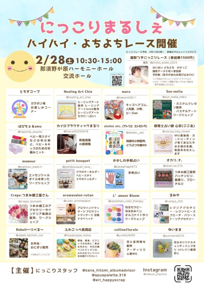 親子向けマルシェ 「にっこりまるしぇ」 はいはい、よちよち、かけっこレースの残りは枠わずかです。 レースご予約は↓ https://airrsv.net/smilefesta-nasu/calendar? Instaは↓です https://www.instagram.com/nikkori_marche?igsh=b2tpbnhvcWg5emlv