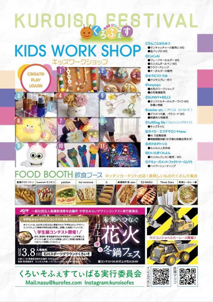 イベント 3/8 くろいそふぇすてぃばる&冬鍋フェス&花火 2026.03.02 by yellnasushiobara 0 くろいそふぇすてぃばる 日時;3月8日(日)10:00〜16:00 学生鍋コンテスト 16:30〜 花火の打ち上げ 18:00〜 場所;石川スポーツグランドくろいそ